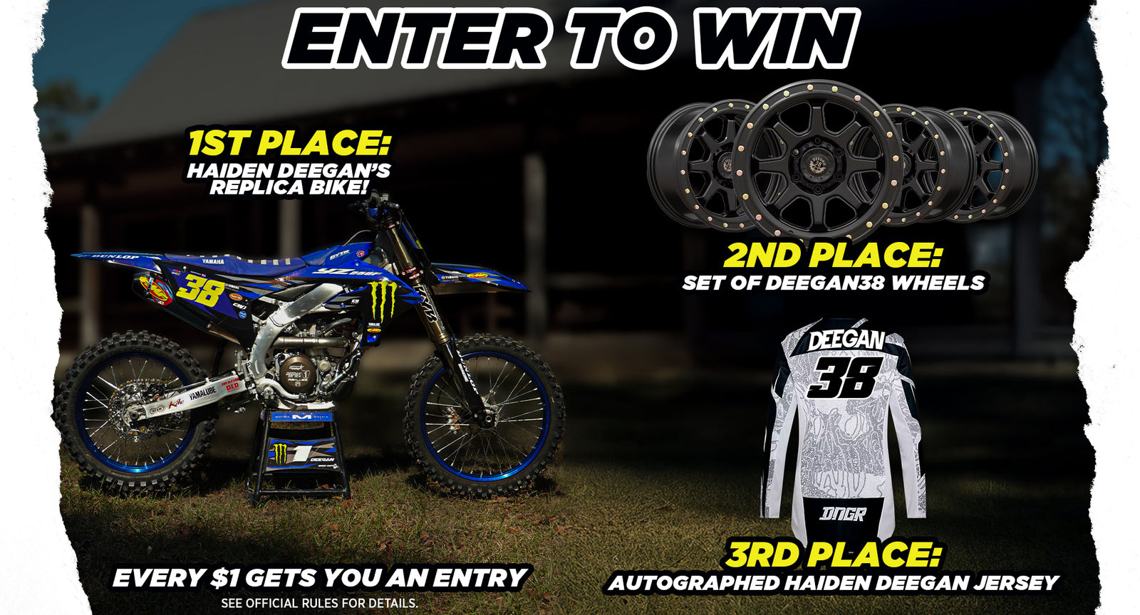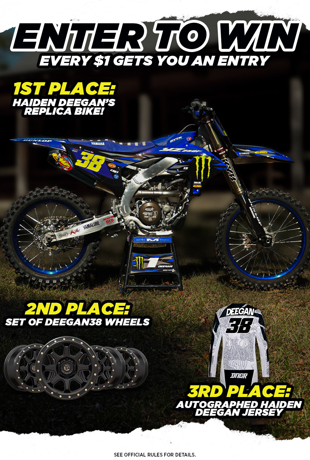 1 lucky grand prize winner is getting a Haiden Deegan Replica Star Racing YZ250F with Xtrig Triple Clamps, Pro Taper Bars & Grips, GYTR Cylinder Head & Ignition Cover, Rekluse Clutch Cover, FMF Slip-On Exhaust & replica plastics & graphics.
