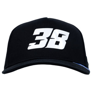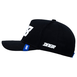 The Overdrive Snapback Hat is a curveball with rubberized #38 race number on front panel, DNGR on left side panel, DNGR woven label on front bill and at back snap seam, and custom internal seam tape.