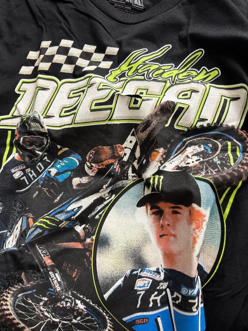 The Monster Choice Deegan Tee in Black features a large front screenprint of an action shot of Haiden Deegan with the iconic Monster Claw.